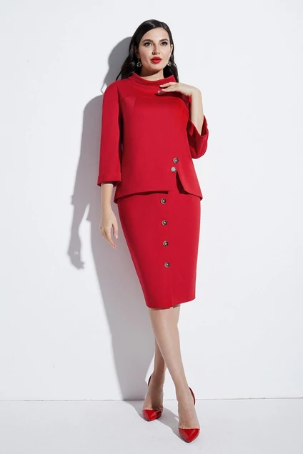 Свитшот с воротником стойкой-хомутом, фигурным низом и спущенной линией плеча. Изделие с кокеткой по переду и спинке. Перед с декоративным элементом с пуговицами. Рукава втачные с отворотами по низу. Юбка на поясе. Переднее полотнище со шлицей по низу и имитацией центральной застёжки с пуговицами. Заднее полотнище с потайной молнией в среднем шве. Юбка на подкладке.