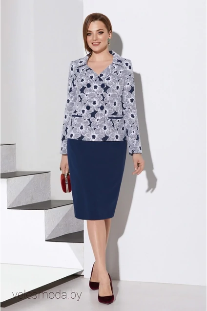 Жакет со стояче – отложным воротником и двубортной застёжкой на петли и пуговицы. Перед с карманами с листочками в нижней части. Рукава втачные. Жакет на подкладке. Юбка на притачном поясе. Заднее полотнище с потайной молнией и шлицей в среднем шве. Юбка на подкладке.