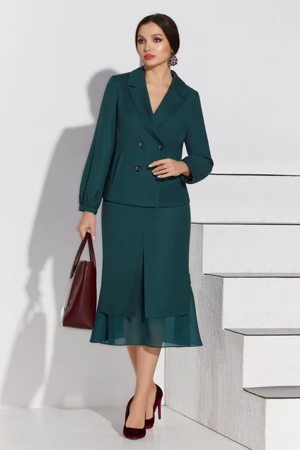 Жакет с воротником пиджачного типа и двубортной застёжкой на петли и пуговицы. Перед с карманами с листочками в нижней части. Спинка с центральным швом и двумя рельефами. Рукава втачные с узкими манжетами по низу. Жакет на подкладке. Юбка на притачном поясе с деталью из шифона по низу. Основная ткань с разрезами по боковым швам и центральному шву переднего полотнища. Заднее полотнище с потайной молнией в среднем шве. Юбка на подкладке.