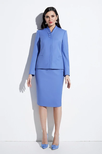 Строгий и сдержанный костюм для истинных ценителей минимализма отлично впишется в ваш гардероб. Жакет полуприлегающего силуэта с V-образным вырезом и цельнокроеной стойкой переходящей в отрезную планку с пришитыми декоративными пуговицами. Застегивается на пришивные кнопки. Перед оформлен отрезными бочками с вытачками и прорезными карманами с листочками. Спинка со средним швом и талиевыми вытачками. Рукава втачные, с отлетной шлицей и застежкой на одну пуговицу. Юбка карандаш с отрезным поясом , застежка на потайную молнию в среднем шве спинки, по низу юбки шлица. Жакет и юбка на подкладке.