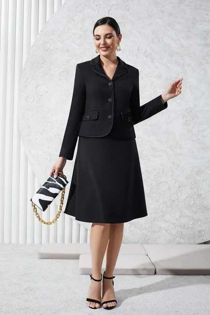 Жакет со стояче-отложным воротником пиджачного типа и центральной застёжкой на петли и пуговицы. Перед с карманами с клапанами в нижней части. Спинка со средним швом и двумя рельефами. Рукава втачные. По воротнику, клапанам, краю борта и низу рукавов идёт кант. Жакет на подкладке.