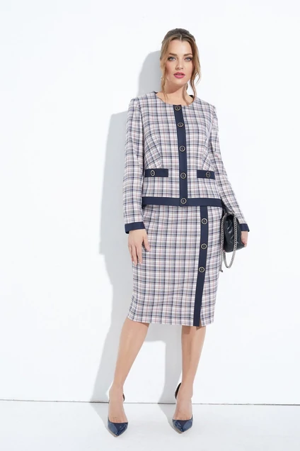 Современный дизайнерский костюм выполнен в стиле а-ля «Chanel» создаст неповторимый модный образ и подчеркнет ваш индивидуальный стиль. Жакет прямого силуэта с округлым вырезом горловины и отрезной планкой из однотона с центральной застежкой на петли и пуговицы. Перед оформлен вертикальными вытачками и втачными листочками с пришитыми пуговицами. Низ жакета и низ рукава оформлены отрезными деталями из однотона. Рукава втачные. Юбка карандаш с отрезным поясом, перед ассиметричный с отрезной планкой из однотона с пришитыми пуговицами, по низу шлица. Спинка цельная, застежка на потайную молнию в боковом шве. В изделии применена современная европейская обработка. Жакет и юбка на подкладке. Жакет и юбка на подкладке.