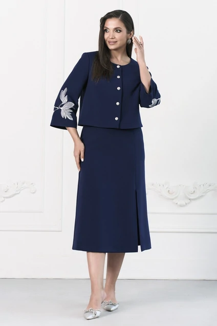 Жакет с круглым вырезом горловины и центральной застёжкой на петли и пуговицы. Спинка со средним швом. Рукава втачные с дизайнерской вышивкой по низу. Жакет на подкладке.