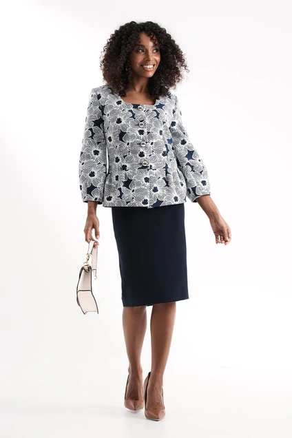 Люксовый костюм выполнен из мягкого итальянского жаккарда с цветочный лейтмотивом, внутренние детали выполнены из гладкого однотонна как на юбке. Жакет полуприлегающего силуэта с объемными рукавами и отрезной баской с мягкими складками. Аристократичный вырез каре добавляет нотку пикантности в элегантный образ. Перед с центральной застежкой на петли и пуговицы, спинка со средним швом и талиевыми вытачками . На обтачке спинки жакета выполнена аккуратная вышивка. Рукава втачные, объемные с застроченными вытачками по низу. Юбка карандаш с отрезным поясом и талиевыми вытачками, застежка на потайную молнию в среднем шве спинки по низу шлица с закрытой обработкой подкладки (диоровская обработка шлицы). В изделии применена современная европейская обработка. Жакет и юбка на подкладке.