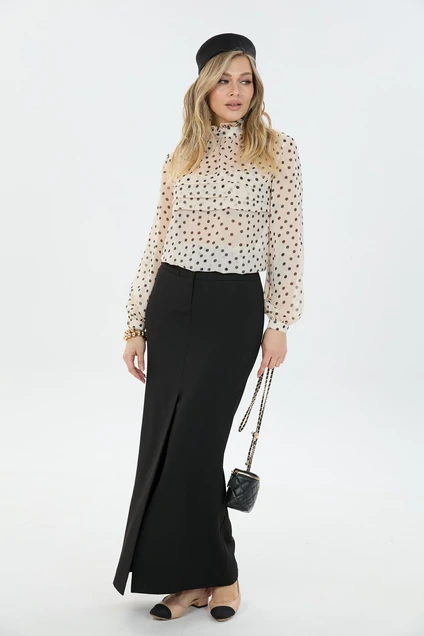 Костюм с юбкой 137071 LM (Лаборатория моды) впечатляет своим уникальным дизайном. Коллекция бренда Лаборатория моды предлагает этот костюм, сочетающий в себе легкость и стиль. Блуза из 100% полиэстера с принтом "горох" и оригинальными складками спереди создает женственный образ. Макси юбка, изготовленная из 20% вискозы и 80% полиэстера, дополнена высоким разрезом по переду, обеспечивая свободу движений и стильный вид. Подходит для осеннего и весеннего сезонов, идеален для создания делового или повседневного образа. Черный цвет юбки и игривый принт делают этот костюм универсальным выбором для любого случая.