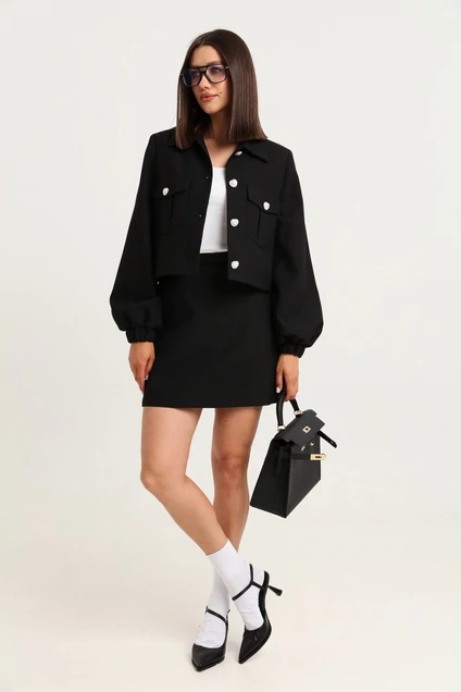 Костюм 2ка, состоящий из жакета и юбки. Укороченный жакет с объёмными рукава. Воротник отложной, застёжка на петли и пуговицы. На груди расположены накладный карманы с клапаном. Юбка "мини" на подкладке, посадка с высокой талией. Застежка на потайную молнию по спинке в среднем шве. Рост фотомодели 175 см. Размер у фотомодели – 44.