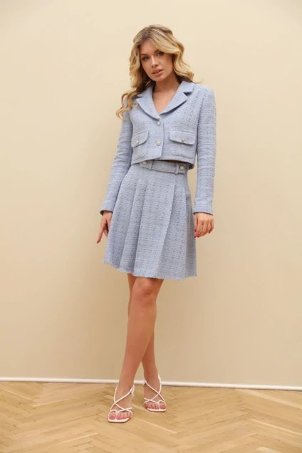 Укороченный однобортный жакет с застежкой на две пуговицы. Воротник пиджачного типа, по переду декоративные накладные карманы.