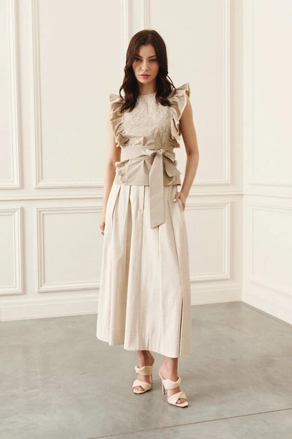 Комплект состоит из блузы и юбки. Блуза прямого силуэта, по центру эффектная вышивка. По переду и спинке рюша на сборку, край рюши обработан тесьмой в цвет вышивки и юбки. Округлый вырез горловины. По спинке застёжка на навесную петлю и пуговицу. К блузе входит в комплект широкий длинный пояс. Юбка А-силуэта на притачном поясе со шлевками. По переду средний шов, переходящий в застёжку гульфик, от шва притачивания пояса глубокие, заутюженные складки. В боковых швах карманы. По спинке средний шов и глубокие складки.