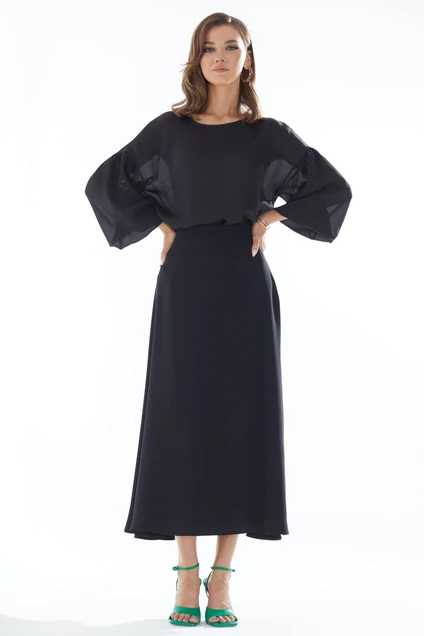 Комлект женский состоит из юбки и блузы. Стильная блузка свободного силуэта из шифона. Горловина округлая, на спинке застежка на петлю и пуговицу. Рукав со спущенной линией плеча со сборкой, по низу резинка. Стильная юбка из плательной ткани силуэт полу-солнце. По верху юбки притачной пояс. В среднем шве застежка на молния. С 50 размера предусмотрена резинка в поясе по спинке. Длина блузки: 62см(44-48р) 64см(50-54р) 66см(56-60р)