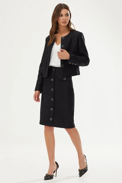 Комплект состоящий из жакета и юбки. Стильный укороченный жакет прямого силуэта из костюмной ткани в стиле’’ шанель”. Горловина округлой формы. Застежка на петли и пуговицы. Рукав втачной двухшовный, по низу декоративная шлица с пуговицами. По переду бочок с вытачками и накладные карманы. Обращаем ваше внимание, что фурнитура может незначительно отличаться от фото. Классическая юбка-карандаш из костюмной ткани в стиле’’ шанель”. По переду декоративная планка и клапаны с пуговицами. По переду и спинке вытачки. По спинке в среднем шве потайная молния, по низу - разрез. Юбка на обтачке с подкладкой. Обращаем ваше внимание, что фурнитура может незначительно отличаться от фото. Длина жакета (47см-44-48р);