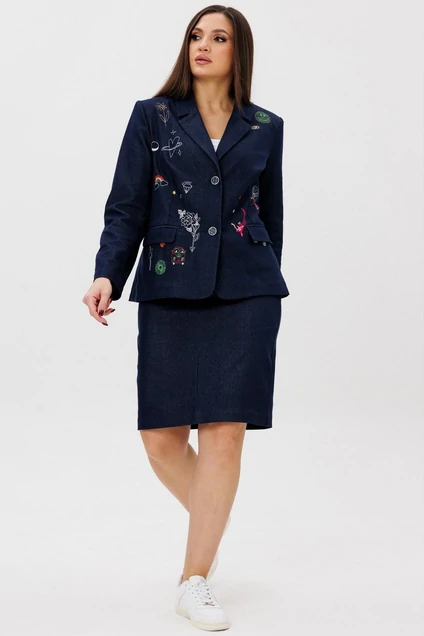 Жакет полуприлегающего силуэта. Воротник пиджачного типа, застежка центральная однобортная на две петли и пуговицы. Полочка с талиевыми вытачками и функциональными карманами "в рамку" с клапаном. На полочке расположена дизайнерская вышивка. Спинка с рельефами. Рукав втачной двухшовный. Низ борта закругленной формы. Жакет без подкладки.