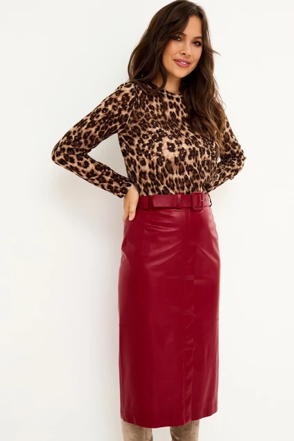 Стильный комплект из трикотажной блузы и юбки, выполненной из эко кожи. Блуза прямого кроя, рукав втачной, горловина округлой формы. Юбка -карандаш с притачным поясом, на подкладке. Застежка по спинке на металлическую молнию. Дополнена съемным поясом с пряжкой, выполненным из эко кожи. Длина блузы от плечевого шва 64см. Длина рукава 60см. Длина юбки 74см.