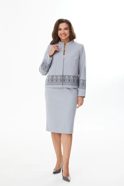 Комплект женский, состоящий из жакета и юбки. Жакет прямого силуэта на подкладке. Спинка со средним швом и вытачками из плеча. Сререди на полочке кокетка. Рукав длинный двухшовный. Застежка в стык на два потайных крючка, воротник стойка. На спинке, полочке и рукавах принт.