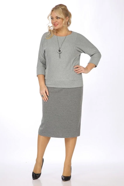 Состав юбки вискоза 70, пэ 25, спандекс 5. Комплект женский состоит из блузона и юбки. Блузон без застежки,вырез горловины круглый,обработан обтачкой. Полочка с вертикальными рельефами,спинка со средним швом. Рукав цельнокроеный. Низ блузона и низ рукава на притачном манжете. Юбка прямая с разрезом сзади, слегка заужена. В левом боковом шве молния декоративная. Пояс на резинке. Длина блузона 63 см, длина рукава 54 см, ширина рукава на уровне глубины проймы 52-27 см, 54-28 см, 56-29 см. Длина юбки 66 см. Реальные замеры блузки 52 ог-116см, от-108см, 54 ог-120см, от-112см, 56 ог-124см, реальные замеры юбки 52 от-86 см, об-110см, 54 от-90 см, об-114см, 56 от-94 см, об-118см.