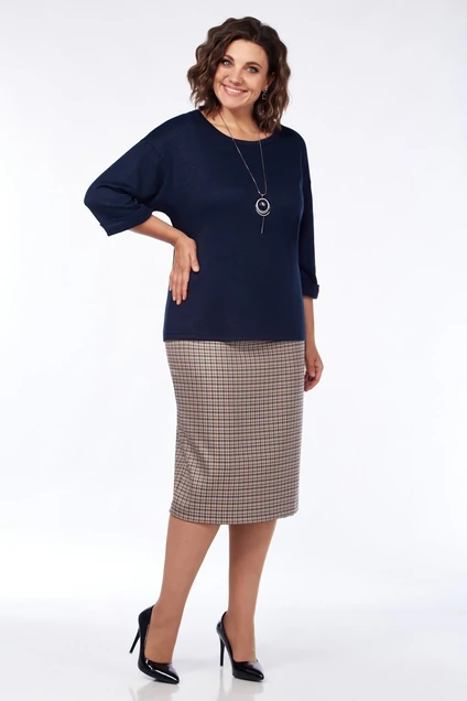 Комплект женский блуза и юбка. Блуза прямого силуэта, рукав втачной одношовный. Длина рукава 3/4. По низу притачной отворачивающийся манжет. Вырез горловины круглый. Юбка полуприлегающего силуэта, по заднему полотнищу талиевые вытачкуи, в среднем шве спинки находится потойная тесьма-молния и шлица на движение. Юбка на круговой декоративной резинке-обтачке. Без подкладки.