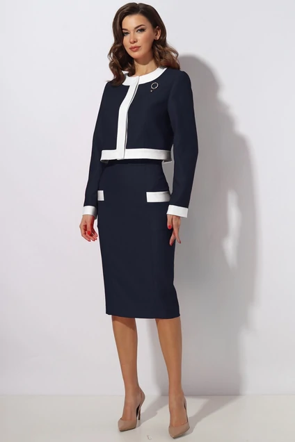 Костюм женский состоит из жакета и юбки.Жакет укороченный прямого силуэта . По горловине, по центру и по низу жакета и рукава отделочная планка.Застёжка на потайные кнопки.Юбка прямого силуэта на притачном поясе по верхнему краю.По бокам имеются функциональные карманы с отделочной планкой.На спинке застёжка на потайную тесьму молния.По низу юбки разрез.Жакет и юбка на подкладке.Брошь в комплекте.Длина жакета по спинке 43 см, рукав 62 см.Длина юбки 65 см.Изделие изготовлено из твидовой ткани.Подкладка ПЭ 100%.Изделие подойдет на рост 164-170 см.Цвет основной ткани:темно-синий.
