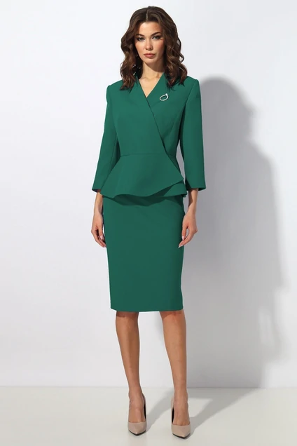 Костюм женский состоит из жакета и юбки.Жакет полуприлегающего силуэта с отрезной баской по линии талии.Низ баски асимметричный.По горловине V-образный вырез.Застёжка на запах на потайные внутренние кнопки.Рукав 3/4.Жакет на подкладке.Состав подкладки: ПЭ 100%.Юбка на подкладке, прямого силуэта ,на поясе и застёжкой на потайную тесьму молния.Длина жакета 58 см , длина рукава 48 см. Длина юбки 62 см.Подойдет на рост 164-170 см. Цвет:темно-зеленый(малахитовый).