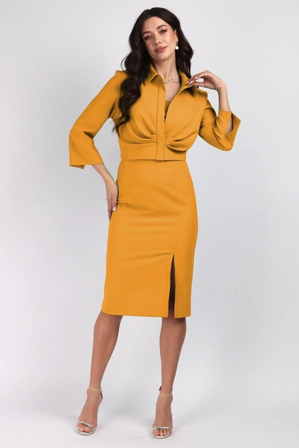 Костюм женский состоит из блузки, топа и юбки.Блузка отрезная по линии талии со складками.На полочке планка. По горловине отложной воротник на отрезной стойке.Рукав втачной 3/4 с разрезом.Топ короткий на резинке.Юбка зауженная к низу с разрезом с левой стороны.Застежка на потайную тесьму молния.Длина блузки 42 см.Длина рукава 47см.Длина юбки 73см.Длина топа по полочке 24 см,по спинке 14см. Изготовлен комплект из текстильной креповой ткани.Подойдет на рост 164-170 см.Цвет:жёлто-оранжевый.