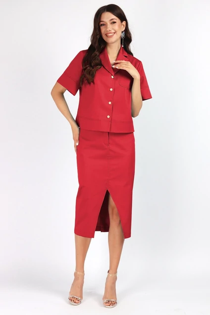 Костюм женский состоит из жакета и юбки.Жакет свободного силуэта с застёжкой на кнопки.По горловине воротник пиджачного типа с отложными бортами.Рукав втачной с притачной манжетой.На полочке функциональный накладной карман.Юбка зауженная к низу с фигурным разрезом.Застежка на тесьму молния .В боковых швах карманы с отрезным бочком.Декоративной фурнитурой являются хольнитены на карманах (цвет золото).Длина жакета 50 см,длина рукава 24 см. Длина юбки с поясом 74 см. Подойдет на рост 164-170 см.Цвет:красной розы.