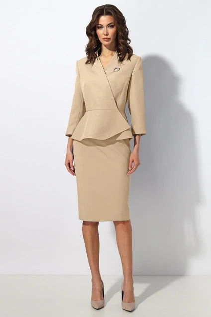 Костюм женский состоит из жакета и юбки.Жакет полуприлегающего силуэта с отрезной баской по линии талии.Низ баски асимметричный.По горловине V-образный вырез.Застёжка на запах на потайные внутренние кнопки.Рукав 3/4.Жакет на подкладке.Состав подкладки: ПЭ 100%.Юбка на подкладке, прямого силуэта ,на поясе и застёжкой на потайную тесьму молния.Длина жакета 58 см , длина рукава 48 см. Длина юбки 62 см.Подойдет на рост 164-170 см. Цвет:светлый бежевый.
