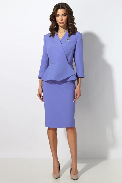 Костюм женский состоит из жакета и юбки.Жакет полуприлегающего силуэта с отрезной баской по линии талии.Низ баски асимметричный.По горловине V-образный вырез.Застёжка на запах на потайные внутренние кнопки.Рукав 3/4.Жакет на подкладке.Состав подкладки: ПЭ 100%.Юбка на подкладке, прямого силуэта ,на поясе и застёжкой на потайную тесьму молния.Длина жакета 58 см , длина рукава 48 см. Длина юбки 62 см.Подойдет на рост 164-170 см. Цвет:лавандовый.