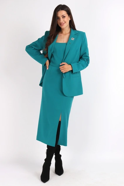 Костюм женский состоит из жакета, топа и юбки.Жакет прямого силуэта с застёжкой на петли и пуговицы.Воротник пиджачного типа с отложными бортами .На полочке функциональный карман с листочкой.Рукав втачной , длинный.Топ полуприлегающего силуэта на бретелях.В боковом шве застёжка на потайную тесьму молния.Юбка длинная, зауженная к низу.На левой половине переднего полотнища разрез.Верхний срез юбки обработан обтачкой.На задней половинке юбки застёжка на потайную тесьму молния. Длина жакета 71 см, длина рукава 63 см, длина юбки 82 см.Длина топа по полочке (без бретели) 26 см,длина по спинке 17,5 см, длина бретели 40 см.Брошь входит в комплект.Жакет и юбка на подкладке,топ на трикотажной подкладке.Состав подкладки: ПЭ 100%.Подойдет на рост 164-170 см. Цвет:темно-бирюзовый.