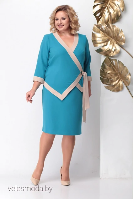 Асимметричный жакет на завязке через золотую крупную блочку делают костюм очень нарядным и запоминающимся. Жакет застегивается на потайную пуговицу и внутреннюю петлю, от этого запросто может носится на распашку поверх нарядного топа. Рукав 3/4. Юбка прямая, пояс частично на резинке, от боков к поясу косые карманы, без подкладки, сзади шлица и застежка на потайную молнию. Длина жакета по среднему шву спинки 54+-1,5см., длина рукава 47+-1см. Длина юбки 64+-1см.