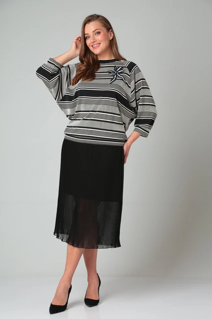 Удобный и универсальный женский юбочный комплект, который займет важное место в Вашем гардеробе. Джемпер свободного кроя, рукав реглан "летучая мышь" — воплощение стиля и комфорта. Брошь, которая идет в комплекте, сделает Ваш образ еще более выразительным. Юбка свободного кроя выполнена из плиссированного шифона — длина миди, пояс на резинке. Оба изделия можно смело комбинировать с другими вещами и обувью Вашего гардероба. Длина джемпера по спинке 65 +/-1 см, длина рукава от горловины 57 +/-1 см. Длина юбки 76 +/-1 см. Изделие подойдет на рост 170 см.
