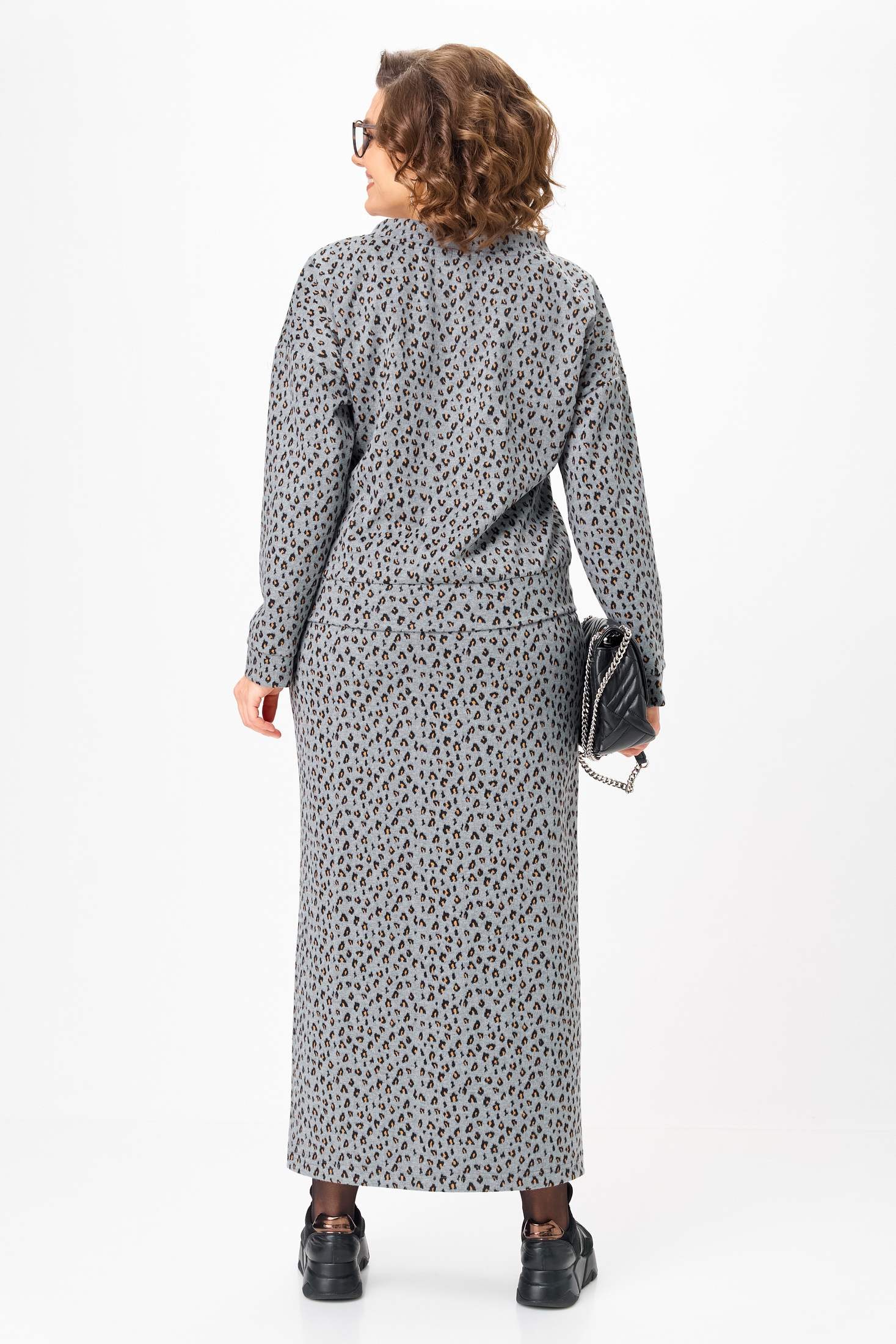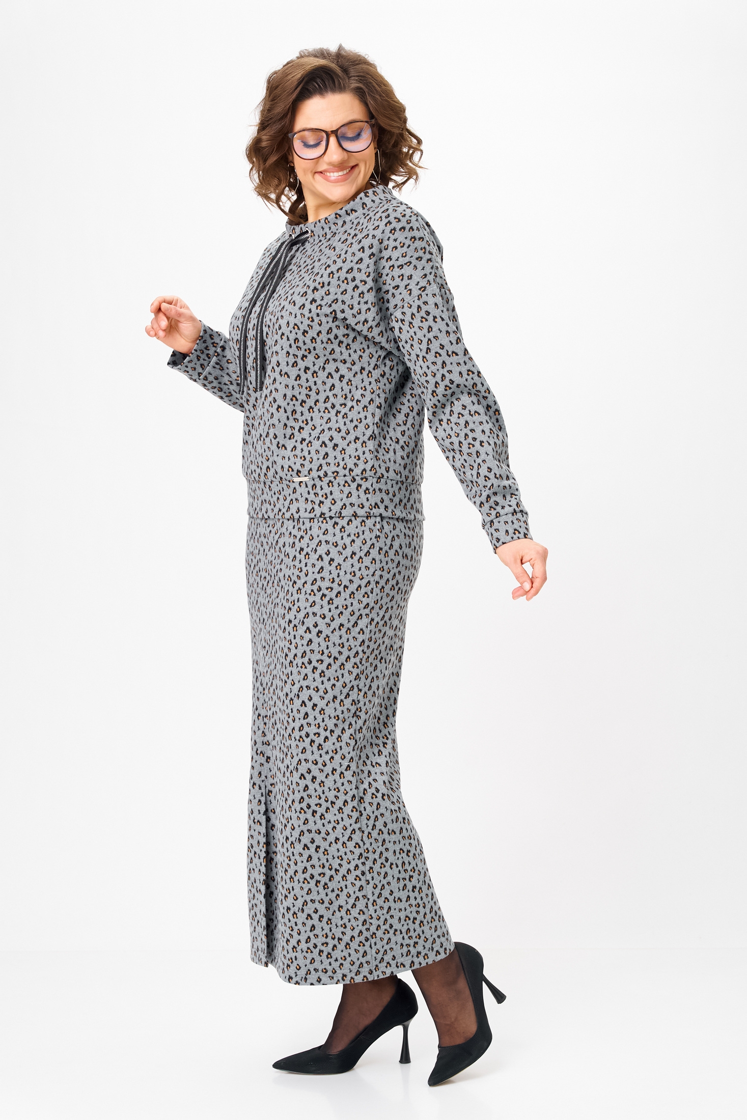 Плотный трикотаж хорошо держит силуэт, не «плывёт» и не вытягивается, при этом остаётся комфортным в движении. Принт — деликатный, небанальный, выглядит дорого и актуально вне сезона. Верх свободного кроя. В горловине — декоративные блочки и втянутая тесьма, которая добавляет образу характер и визуальный акцент, не утяжеляя изделие. Деталь работает как украшение и делает образ собранным без лишней строгости.Юбка макси с разрезом добавляет динамики и лёгкости силуэту. Длина джемпера по спинке 60 см +/- 2 см, длина рукава 68 см +\- 1 см, длина юбки по боковому шву 95 см. Изделие подойдет на рост 170 см.