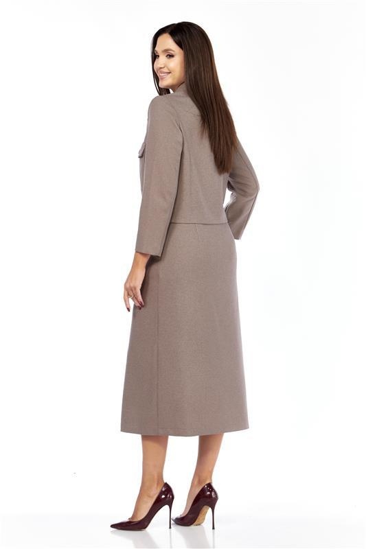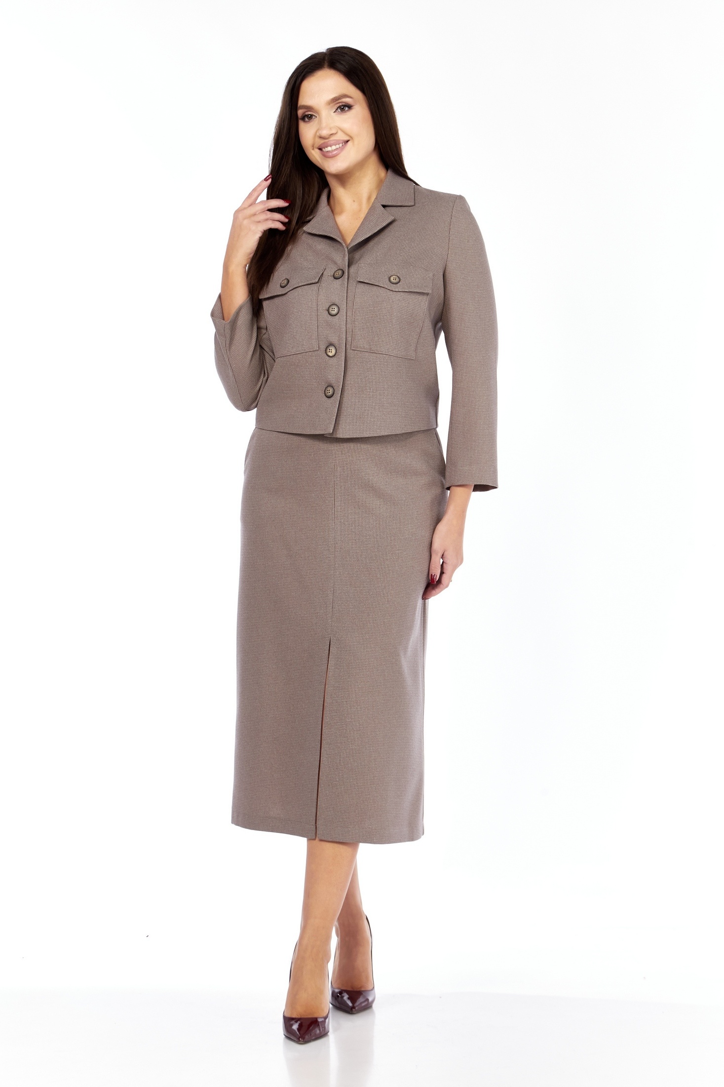 Костюм женский состоящий из жакета и юбки. Жакет приталенного силуэта на подкладке спереди, со втачным рукавом длины ¾. Имеет отложной воротник с лацканами, по переду застежка на петли и пуговицы, на груди накладные карманы с клапанами, которые застегиваются на петлю и пуговицу.