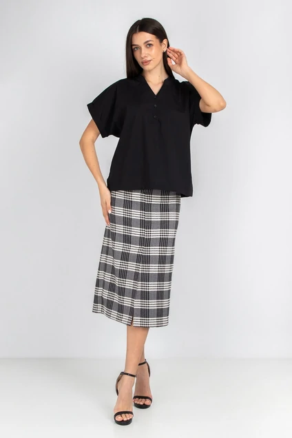 Комплект состоит из Блузки и Юбки. Блузка свободного покроя до середины бедра с разрезами в боковых швах. Рукав кимоно. Воротник -стойка , спереди застёгивается на 3 петли-пуговицы.