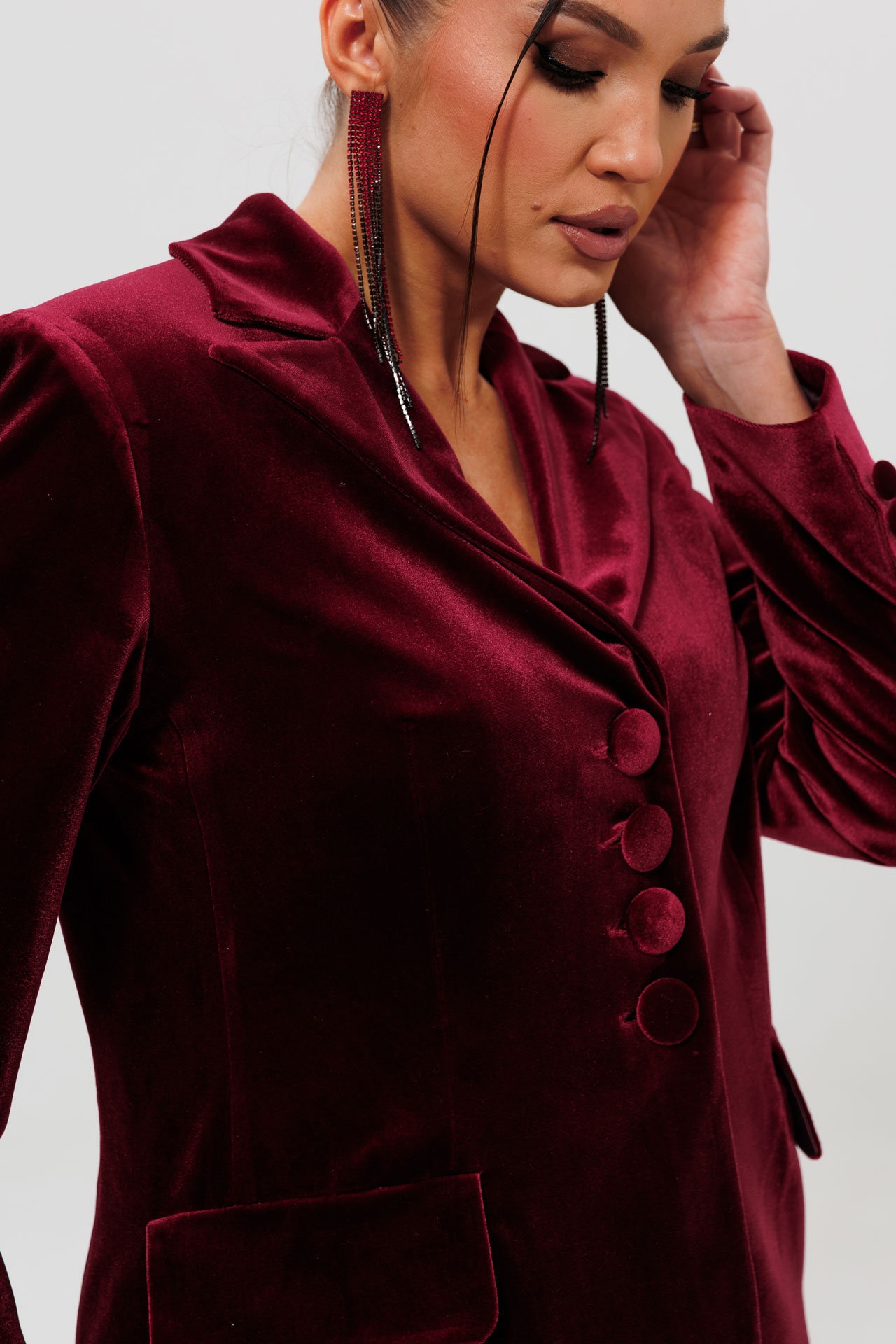 Этот элегантный бордовый костюм с юбкой-карандаш станет основой вашего делового гардероба. Комплект из полуприлегающего жакета и классической юбки выполнен из качественного бархата, что добавляет образу статусности и стиля. Жакет на подкладке с отложным воротником и декоративными пуговицами легко комбинируется с другими вещами, а юбка-карандаш идеально подчеркивает фигуру, оставаясь комфортной для носки в течение всего дня. Данный костюм бордового цвета — прекрасный выбор для работы, деловых встреч, конференций или любого события, где важны безупречный вкус и элегантность.