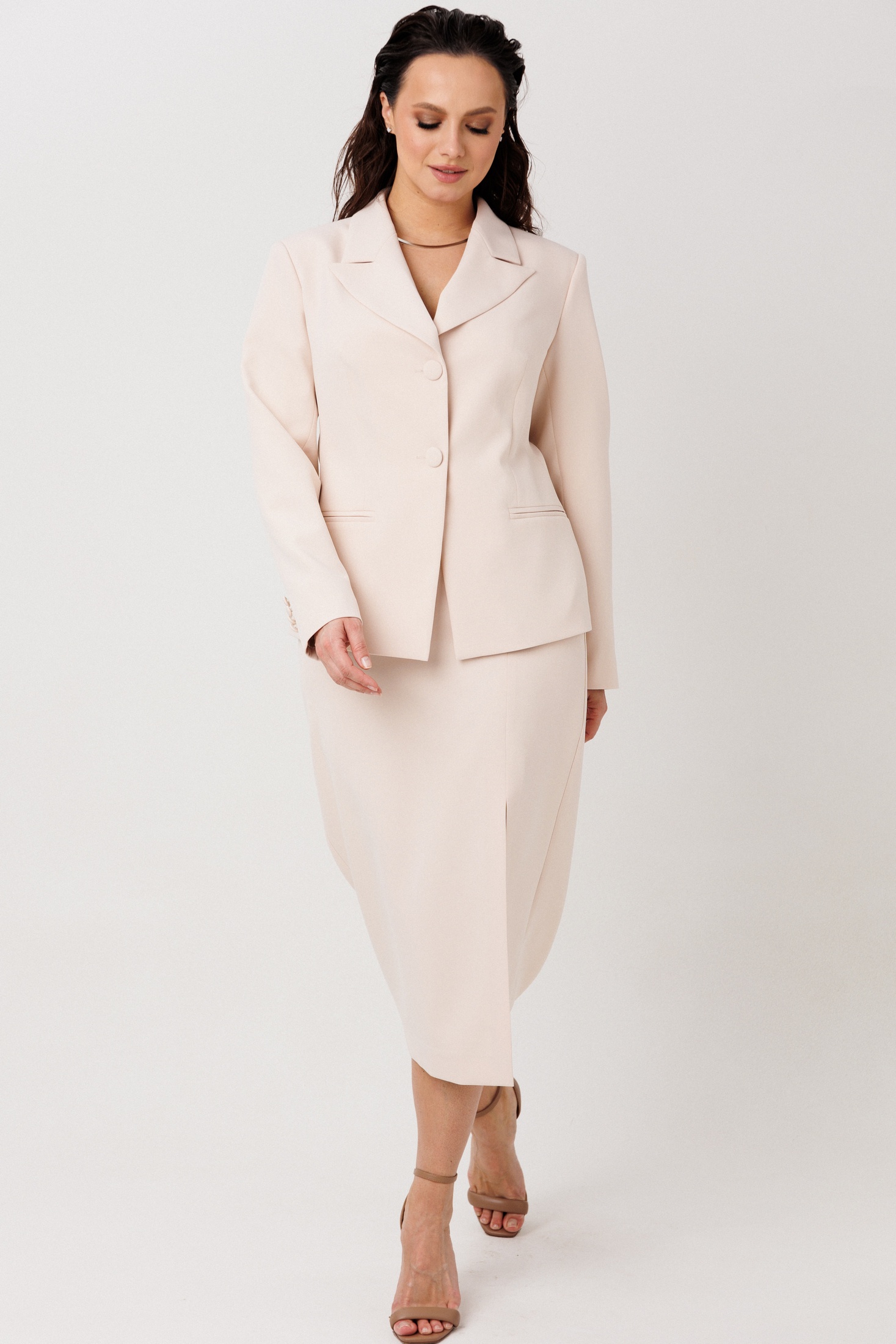 Костюм с юбкой 1296 бежевый MisLana — это идеальный выбор для деловых встреч и особых случаев. Из коллекции бренда MisLana, этот комплект из жакета и юбки выполнен из полиэстера, вискозы и лайкры, что обеспечивает комфорт и стиль в течение всего дня. Жакет с лацканами и застежкой на две пуговицы, дополнен прорезными карманами, а также имеет декоративную съемную брошь. Юбка-карандаш длиной миди с разрезом в боковой части и застежкой на молнию обеспечивает свободу движений. Бежевый цвет подходит для любого сезона, а подкладка добавляет удобства и тепла. Жакет и юбка прекрасно комбинируются, создавая классический и стильный образ.