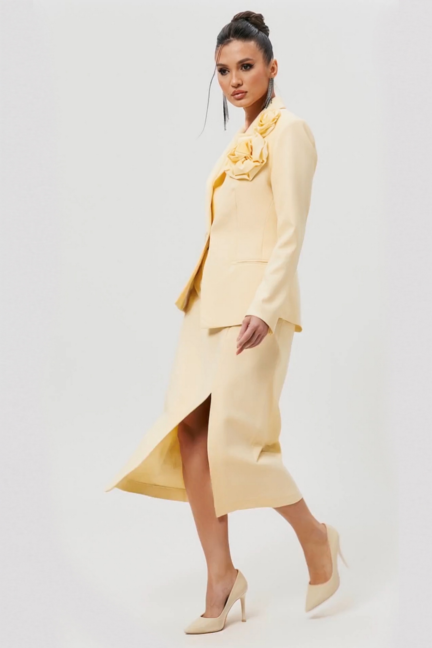 Костюм с юбкой 1296 желтый MisLana воплощает утонченное сочетание классического стиля и модных акцентов. Коллекция бренда MisLana предлагает изысканный комплект, состоящий из полуприлегающего жакета и элегантной юбки-карандаш. Изготовленный из полиэстера, вискозы и лайкры, костюм обеспечивает комфорт и эластичность, идеально подходящий для демисезонного использования. Жакет оснащен лацканами и двумя пуговицами, дополнен прорезными карманами и съемной брошью. Юбка длиной миди открыта от колена до низа с молнией в центральном шве, предоставляя свободу движения. Слегка зауженные линии изделия подчеркивают женственность. Эффектный желтый цвет добавляет яркости вашему образу, а подкладка обеспечивает удобство при носке.