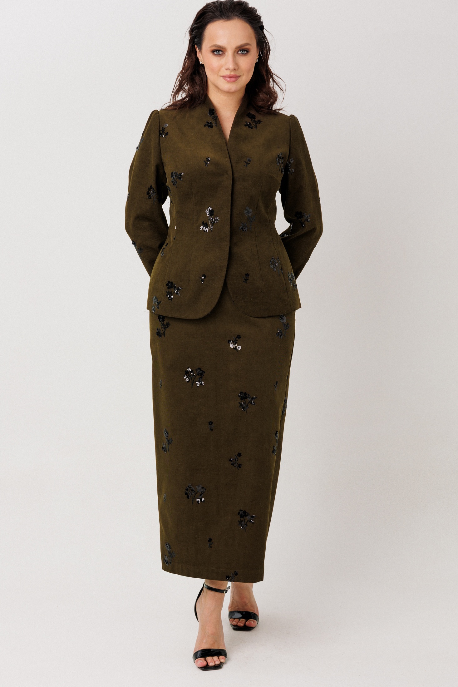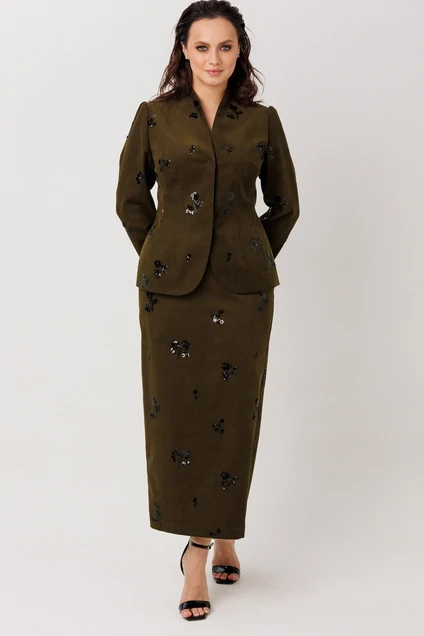 Костюм с юбкой 1297 MisLana — это изысканная интерпретация классического стиля. Коллекция бренда MisLana включает жакет и юбку, выполненные из штруксовой ткани, дополняемой декоративной вышивкой пайетками в виде цветочных мотивов. Эффект люминесценции при движении добавляет выразительности образу. Жакет приталенного силуэта на подкладке застегивается на две потайные кнопки, а юбка-карандаш с задней шлицей обеспечивает удобство и свободу движений. Цвет насыщенный коричневый с примесью зелени подчеркивает глубину и утонченность образа. Комплект подходит для осенне-зимнего сезона и идеально сочетается с деловыми и вечерними мероприятиями. Детали, такие как частичная резинка на поясе и застежка на молнию, добавляют практичности и комфорта.