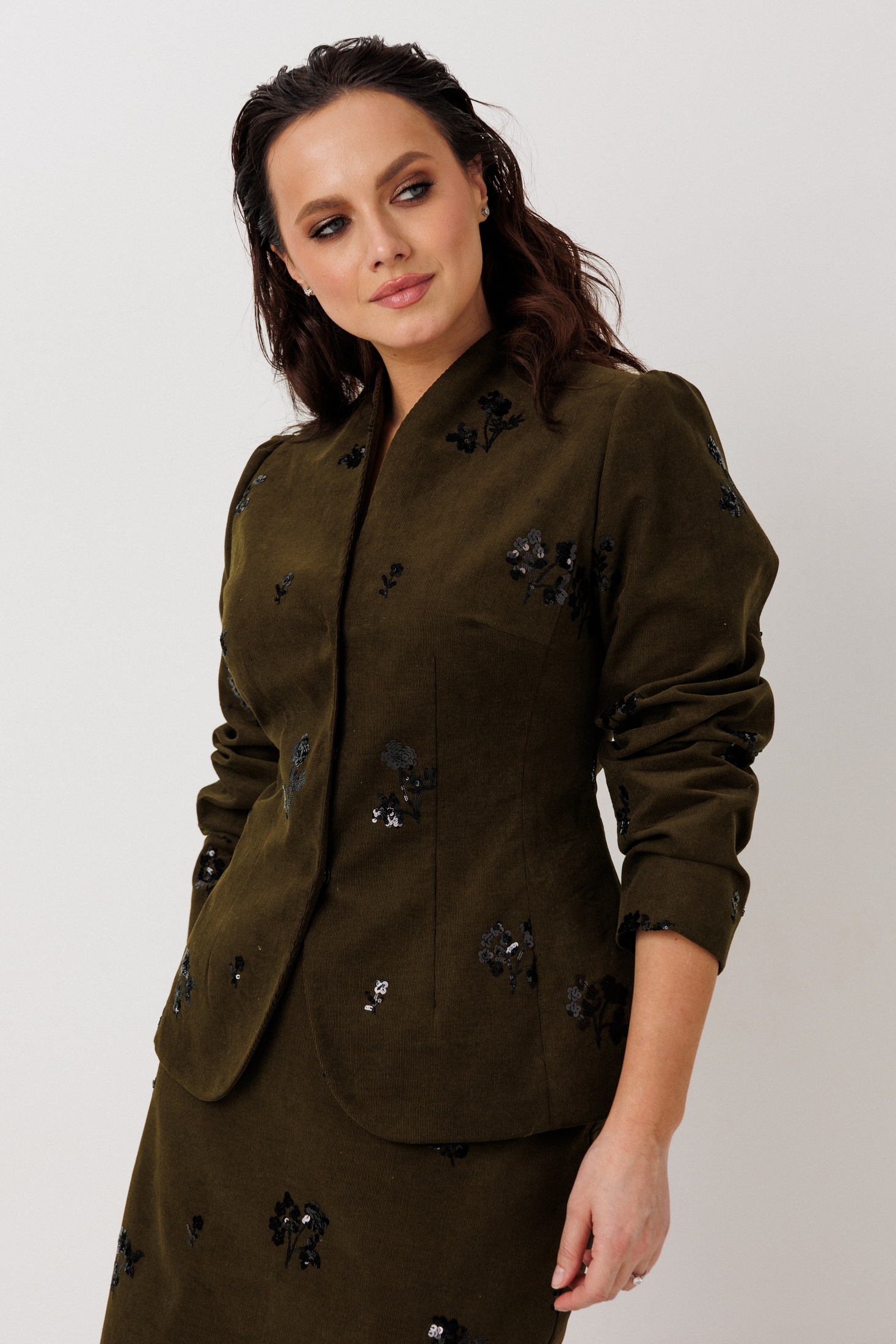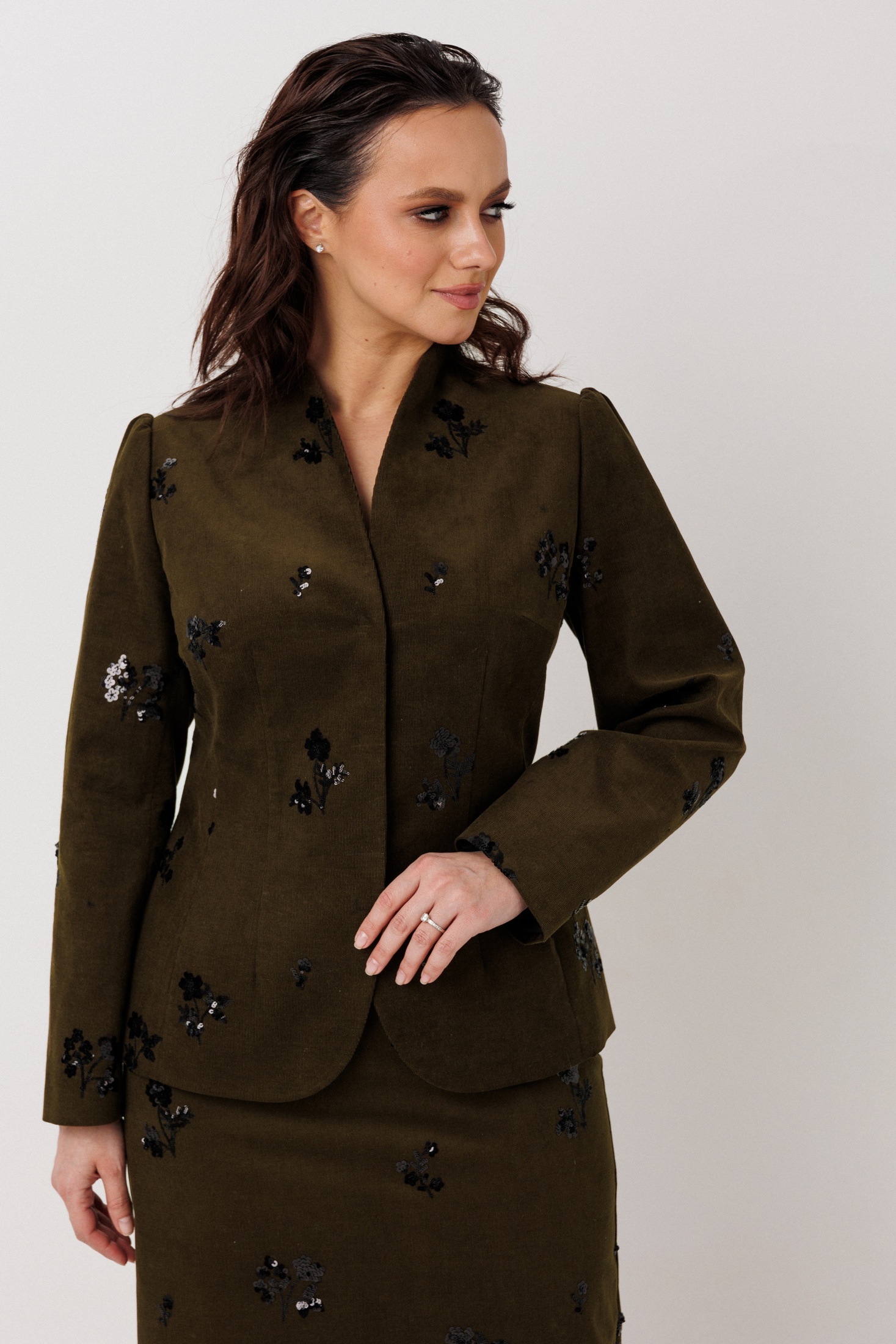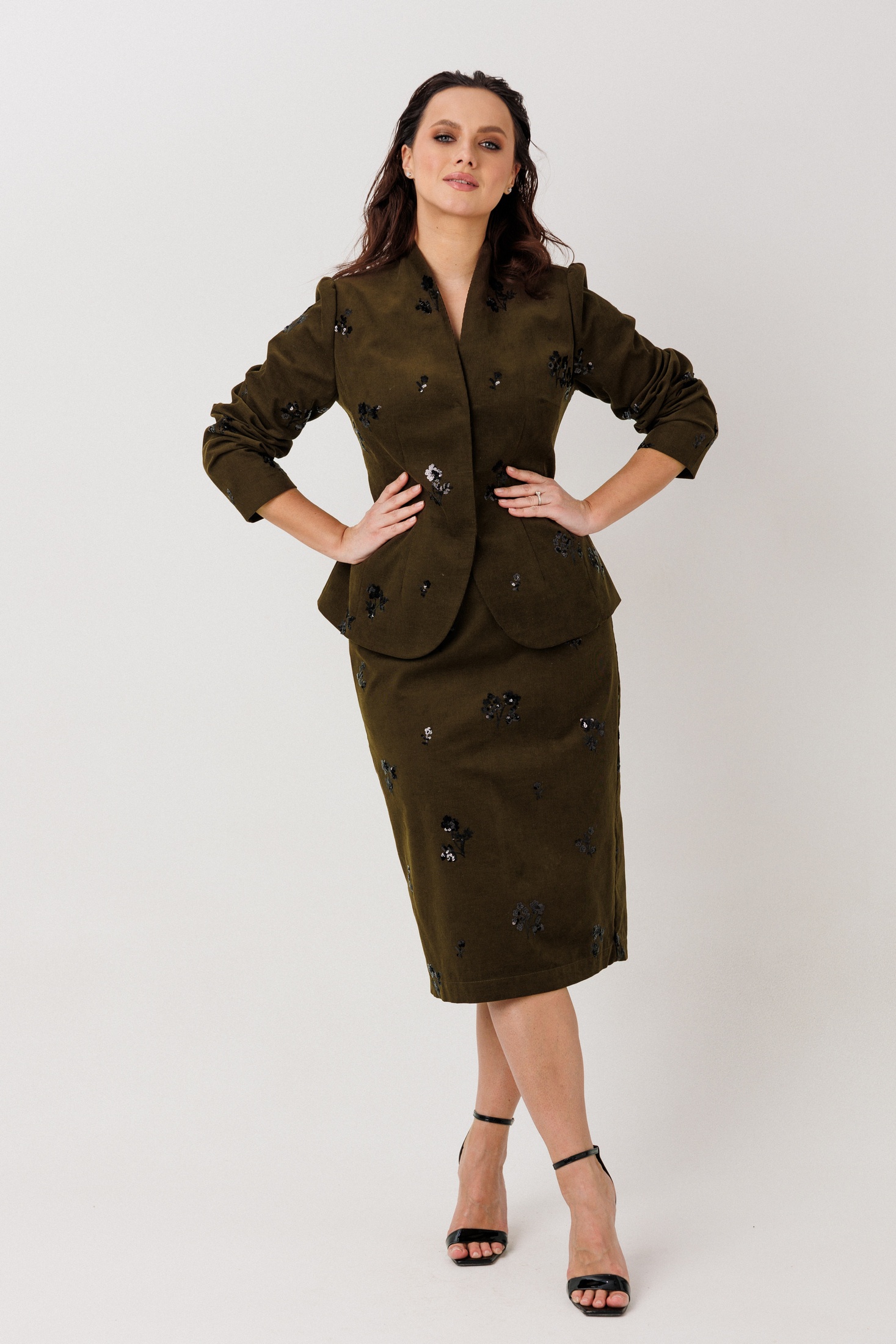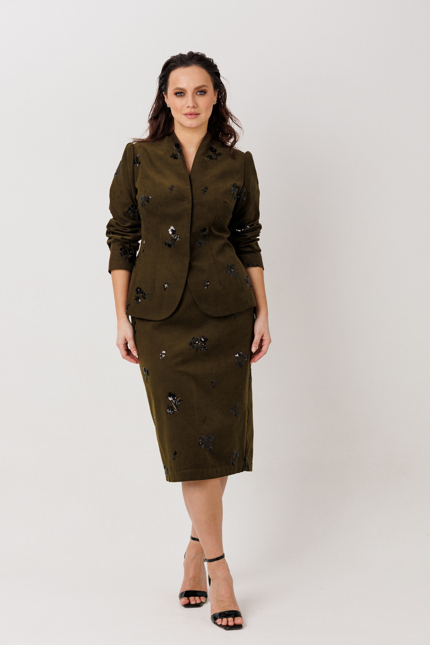 Костюм с юбкой 12971 MisLana — это стильный выбор для современных женщин. Коллекция бренда MisLana предлагает костюм-двойку из штруксовой ткани, украшенной декоративной вышивкой пайетками. Жакет приталенного силуэта на подкладке с замаскированной застежкой на потайные кнопки. Юбка-карандаш с задней шлицей дарит комфорт при движении и подчеркивает элегантность образа. Пояс юбки на обтачке с молнией и частичной резинкой для идеальной посадки по талии. Костюм создан для офисных и официальных мероприятий, гармонично сочетая классическую строгость с актуальным декором. Подходит для прохладного сезона и доступен в универсальном темном оттенке, подчеркивающем харизму владельца.