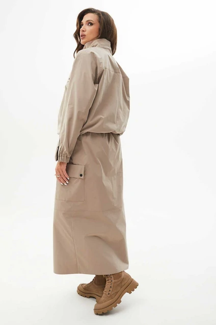 Костюм женский состоит из жакета и юбки выполнены из плащевой ткани. Жакет свободный с цельнокроеными рукавами, без подкладки, по низу притачная планка, в которую продета резинка. По переду горизонтальный подрез, прорезные карманы с листочкой , клапан с кнопкой, молния и застёжка на тесьму молния. Воротник стойка. По низу рукава резинка и застёжка небольшая молния. Юбка прямого силуэта на притачном поясе на резинке с фиксирующей затяжкой. По переду центральный шов заканчивается разрезом. Горизонтальный подрез по переду и спинке. По бокам большие накладные карманы с клапанами на кнопках. Юбка на подкладке.