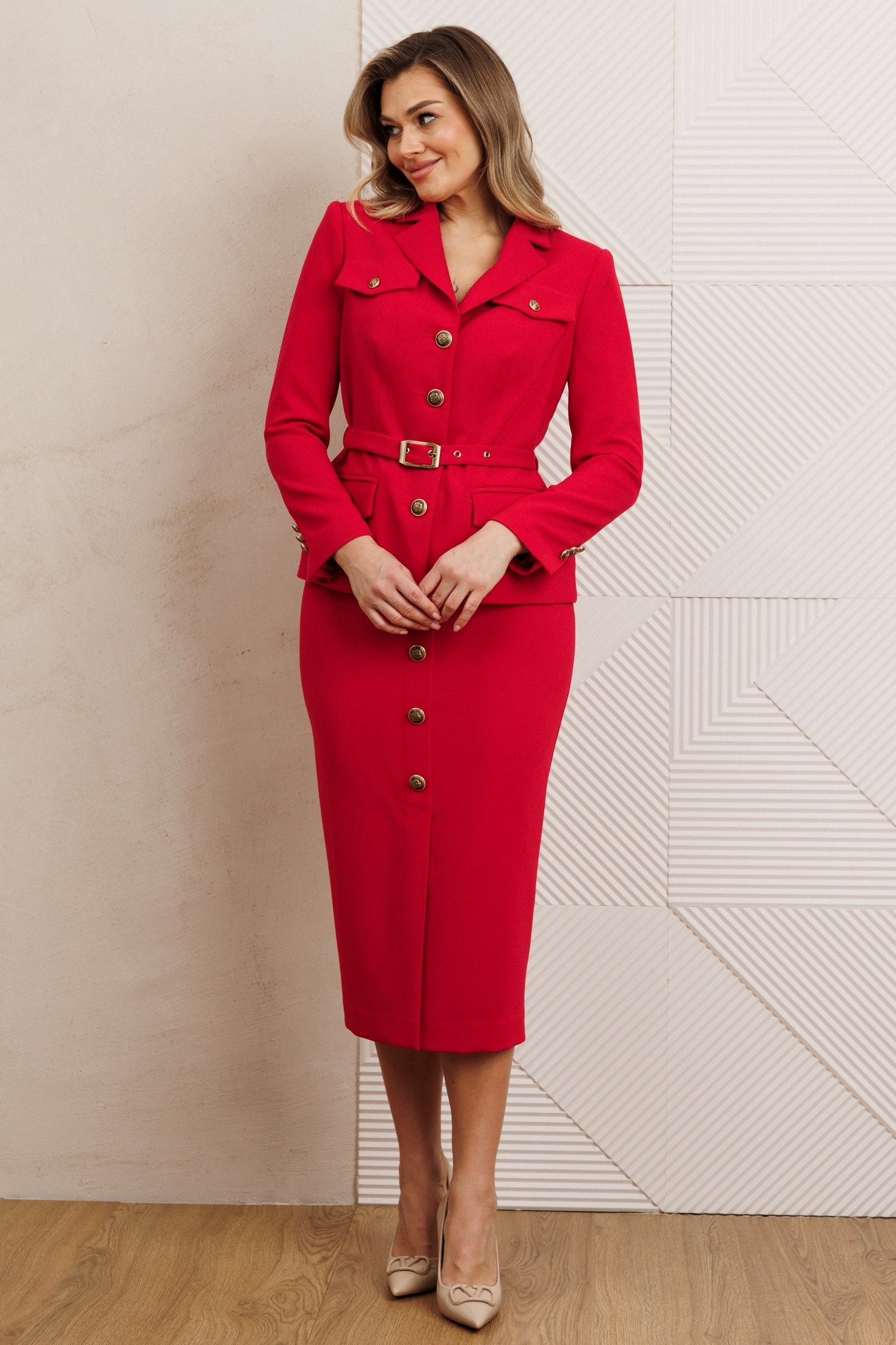 Юбка-карандаш - воплощение классической офисной элегантности. Ее строгий силуэт, подчеркивающий линию бедер, создает безупречно профессиональный образ. Юбка зауженная к низу. Изюминка дизайна спереди: элегантная шлица, декорированная аккуратной отделкой из пуговиц. Эта деталь не только добавляет динамику и визуальный интерес, но и обеспечивает свободу движения. Боковая застежка-молния обеспечивает аккуратную посадку и легкое надевание, сохраняя чистоту линий спереди и сзади. Притачной пояс с резинкой сзади. На подкладке. Такая юбка является не просто базовой вещью, а законченным стильным акцентом Вашего делового гардероба. Она безупречно сочетается с блузами, жакетами и топами, создавая элегантный и уверенный ансамбль. Длина жакета: 63 см, длина юбки: 84 см
