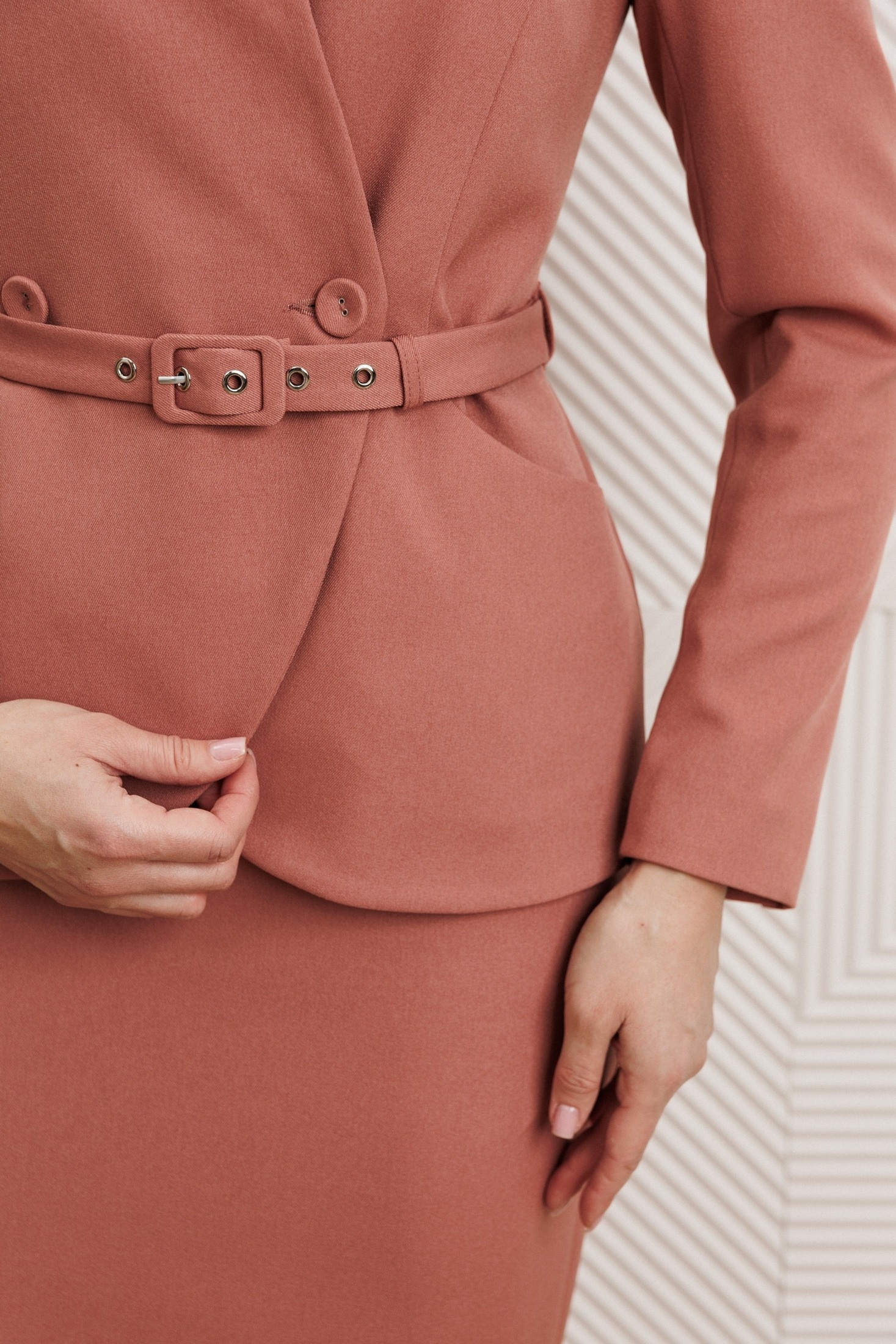 Жакет полуприлегающего силуэта с двубортной застёжкой на одну пару обтяжных, из основной ткани, пуговиц и одной потайной. Край борта фигурной формы,придающей динамичность жакету. На полочке выполнены фигурные рельефы, которые дополнены функциональными карманами, гармонично вписывающимися в общую структуру изделия. Спинка со средним швом и вертикальными рельефами из проймы. Воротник с цельнокроенной стойкой, что придает жакету элегантный и строгий вид. Рукава двухшовные, со шлицей в локтевом шве на одну пуговицу, также обтяжную из основной ткани.Жакет дополнен шлёвками и съемным поясом из основной ткани с пятью блочками на обтяжную пряжку, чем придает дополнительный акцент на талии.