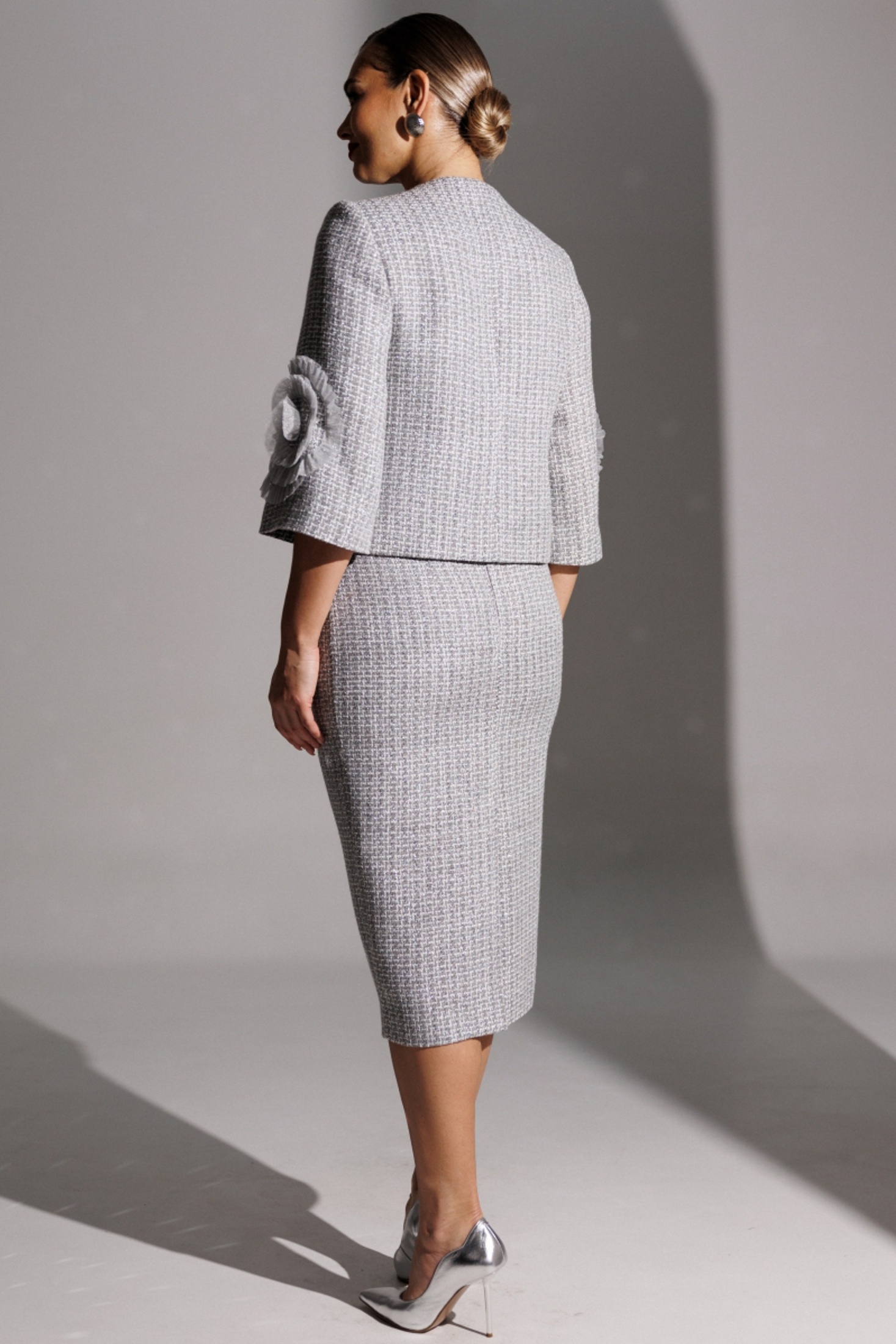 Костюм включает в себя стильный жакет и элегантную юбку. Жакет выполнен в полуприлегающем силуэте с центральной застежкой на пуговицы, что придает ему аккуратный вид. Спинка жакета имеет средний шов, а передняя часть украшена вертикальными рельефами и накладными карманами с пуговицей. Округлая горловина дополнена кантами по краю, что создает изящный акцент. Рукава длиной 3/4 слегка расширяются к низу и оформлены отделкой в виде цветка из отделочного материала, добавляя индивидуальности. Юбка имеет зауженный к низу силуэт и удобно сидит на притачном поясе с резинкой, обеспечивая комфорт. Молния и шлица расположены в среднем шве. Весь костюм подкладке, что придает ему дополнительный комфорт и завершенность.