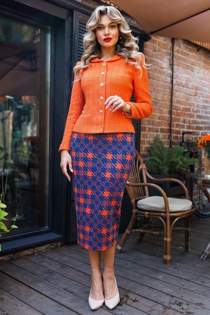 Костюм женский, состоящий из жакета и юбки. Жакет в стиле "шанель" из буклированного материала с центральной застежкой на петли-пуговицы. По переду вертикальные рельефы, бочки, крупные накладные карманы (в цвете василек), листочки, имитирующие карманы (в оранжевом цвете). Спинка со средним швом и рельефами. Воротник-шалька. Рукава втачные, двухшовные. Жакет на подкладке. Юбка зауженная к низу. Молния и шлица в среднем шве. Пояс на кокетках. Юбка на подкладке.