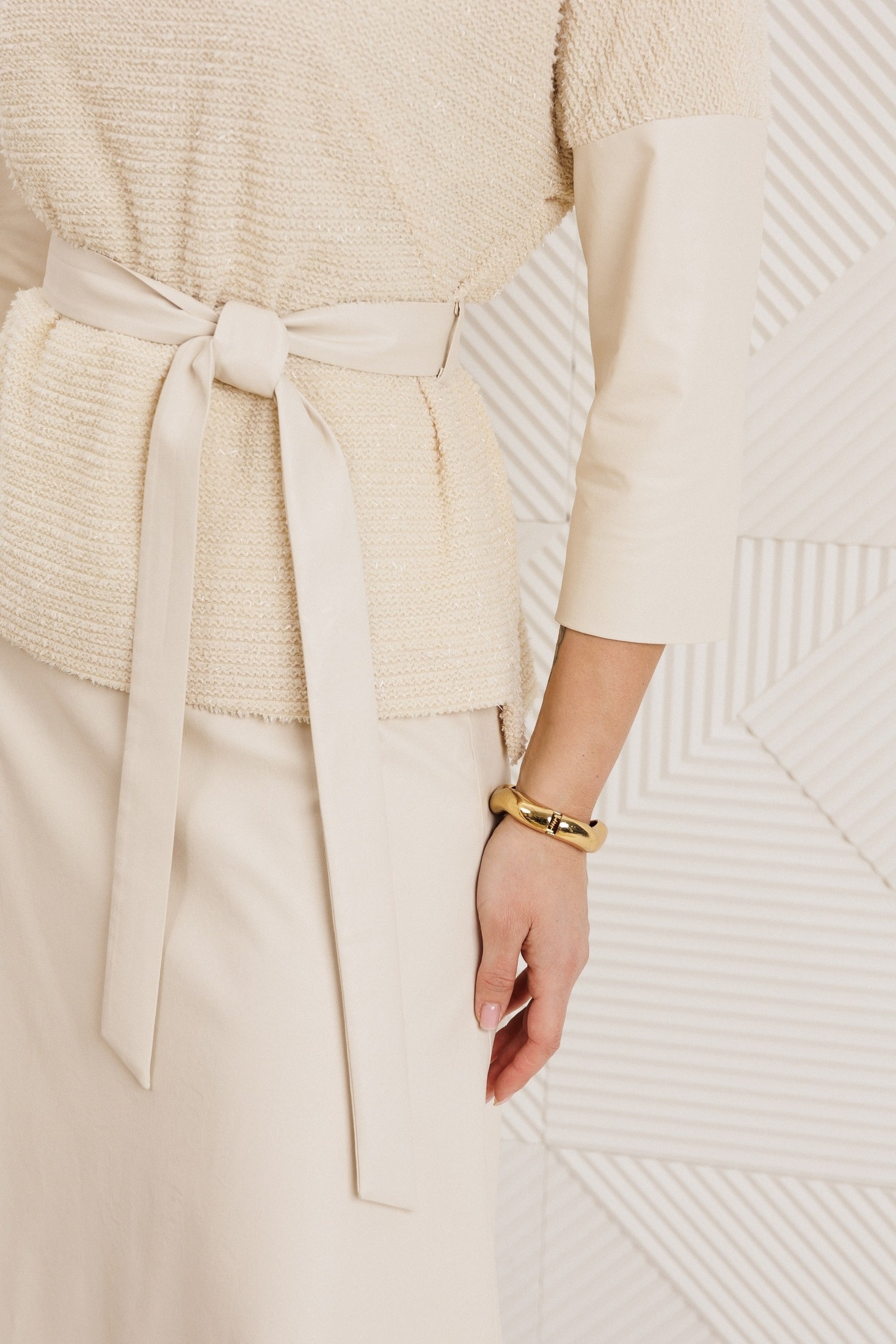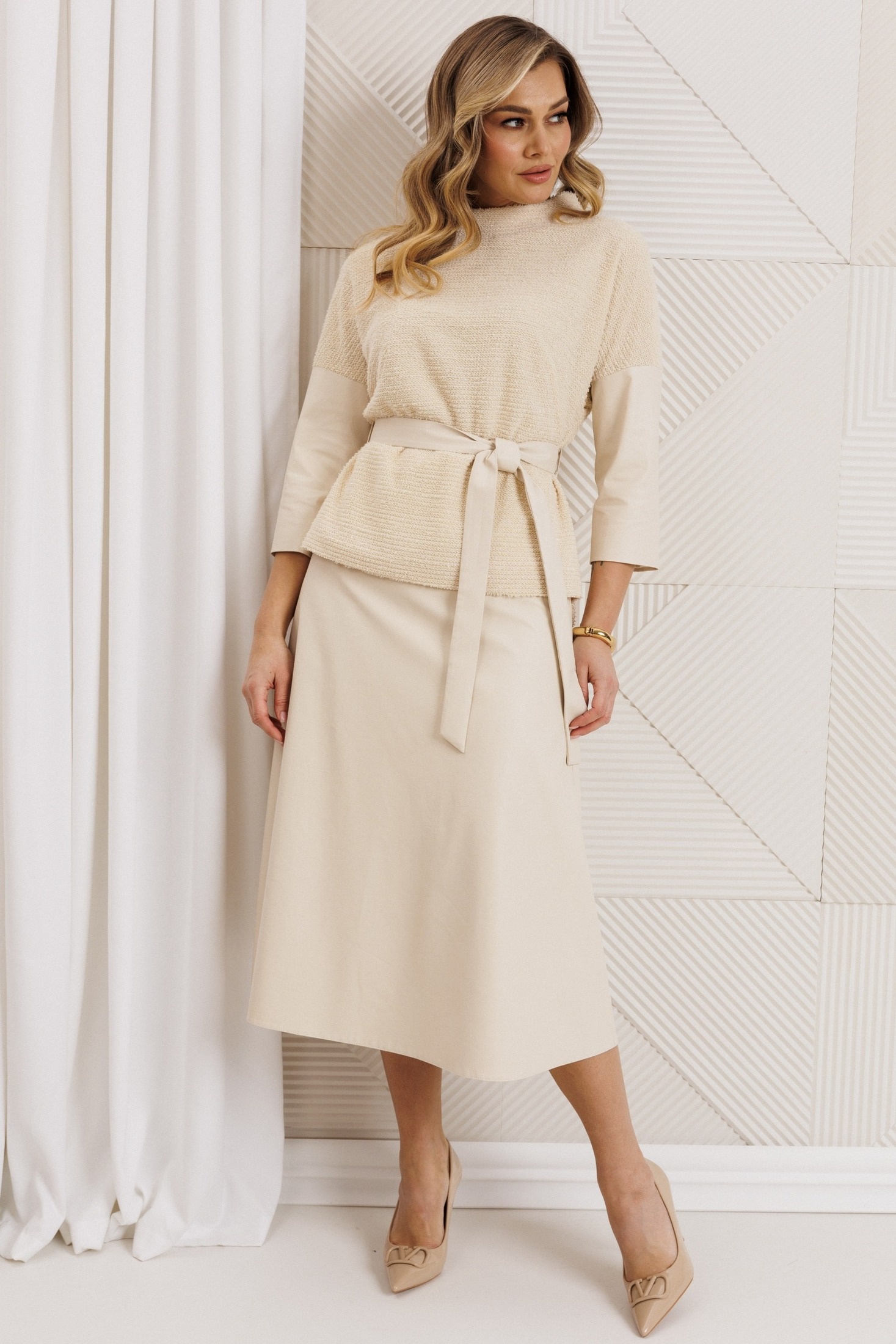 Костюм с юбкой 26-2718 молочный Мода-Юрс представляет собой стильный и утонченный вариант для особого случая. Коллекция бренда Мода-Юрс выполнена из качественных материалов: полиэстера с добавлением вискозы и люрекса для блузона, и кожи для юбки. Блузон имеет нагрудные вытачки и воротник-стойку, а юбка с притачным поясом и молнией сбоку. Цвет молочный придаёт образу лёгкость и изящество. Средней длины комплект разработан для комфортной весенней носки, и прекрасно подойдет для повседневных и деловых мероприятий. Дополнен поясом, он акцентирует внимание на талии и завершает созданный образ.
