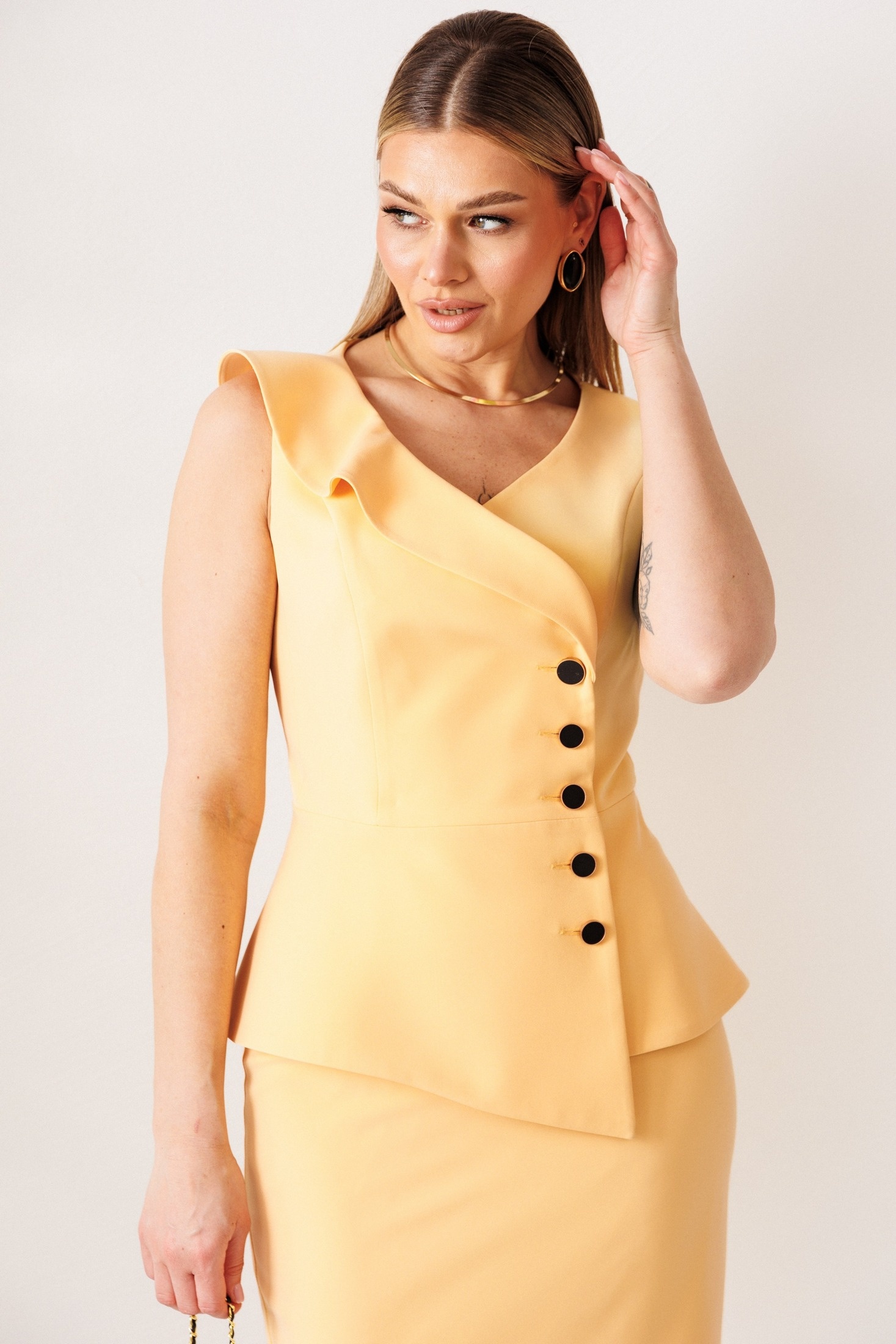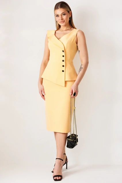 Костюм с юбкой 26-2977 абрикос Мода-Юрс — это стильный выбор для женщин, ценящих моду и качество. Коллекция бренда Мода-Юрс выполнена из полиэстера и спандекса, обеспечивающих комфорт и эластичность в носке. Жакет без рукавов с асимметричной баской и воланом придаёт образу динамичность, а юбка с прямым силуэтом и шлицей на спинке обеспечивает свободу движений. Застёжка на потайную молнию и пуговицы сохраняет лаконичность дизайна. Благодаря универсальному абрикосовому цвету, костюм идеально подходит для создания образов в классическом и офисном стилях весной и летом. Комплект на подкладке включает жакет длиной 57,5 см и юбку длиной 73 см, что обеспечивает идеальную посадку на фигуре.