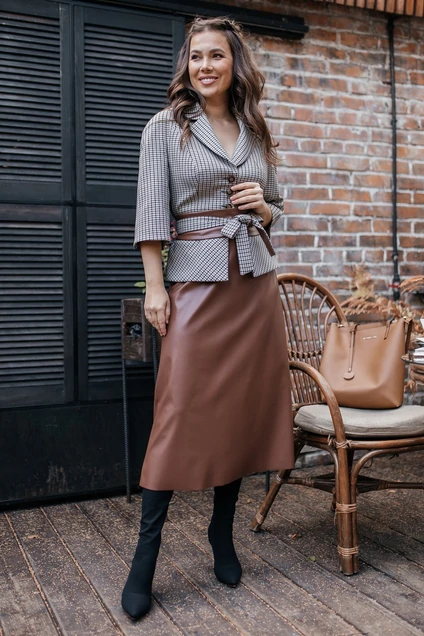 Бестселлер нашей коллекции - двухпредметный костюм, состоящий из жакета и юбки. Акцентом данного комплекта является съемный пояс. Для создания данного образа мы использовали мелкую клетку в тандеме с эко-кожей. Жакет прилегающего силуэта с отрезной баской по переду и спинка с рельефами. Рукав-реглан.Юбка А-силуэта на притачном поясе, сзади с резинкой. Застежка на тесьму-молнию в боковом шве. Костюм на подкладке.