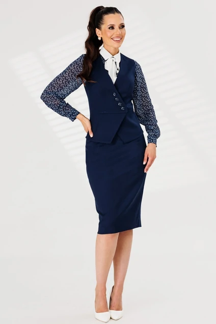 Стильный трехпредметный комплект для офиса. Комплект состоит из жилета, блузы и юбки. Жилет полуприлегающего силуэта с рельефами и фигурной баской. Застежка двубортная на петли-пуговицы. Вдоль линии борта жилет на подкладке. Блуза прямого силуэта в боковых швах с разрезами. По переду с нагрудной вытачкой, выходящей из бокового шва. Воротник рубашечный. Рукав втачной, одношовный, сверху по окату с небольшой сборкой. Застежка на петли-пуговицы. Юбка прямая, зауженная к низу, сзади со средним швом, переходящим в шлицу. Верх юбки на притачном поясе, по бокам с резинками. Юбка на подкладке. Дополнением и ярким акцентом является бант на блузе.