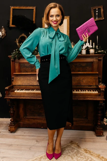 Комплект классического стиля, состоящий из блузки и юбки необычного покроя, что несомненно будет приковывать взгляды окружающих. Блуза из легкого, струящегося шифона, с необычным рукавом и манжетой с рюшей. По переду отрезная кокетка со сборкой по полочке. Воротник-стойка, переходящий в изысканный бант. Классическая юбка-карандаш с ассиметричным подрезом, декорированным пуговицами. Широкий декоративный пояс, к нему дополнением идет съемный бархатный пояс.