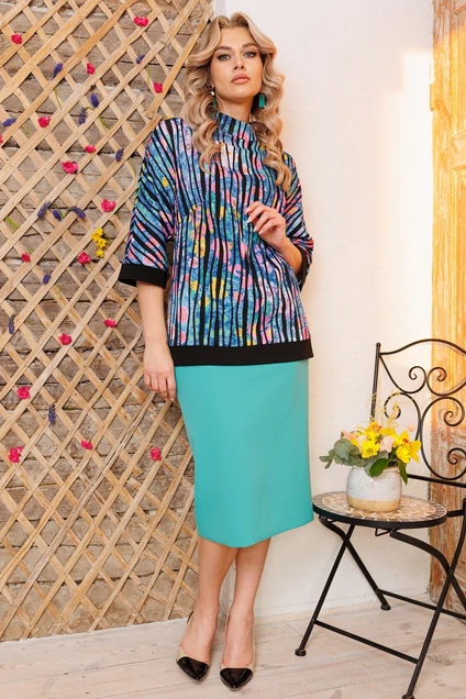 Костюм с юбкой 2805 бирюза цветы Мода-Юрс