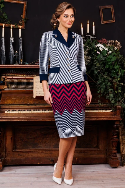 Классическая гамма в безупречной форме. Жакет в полоску в сочетании с однотоном полуприлегающей формы. Жакет с рельефами по переду и спинке, на полочках настрочены клапаны. Воротник пиджачной формы. Рукав втачной, двухшовный, по низу рукава с притачной манжетой. Юбка прямая, зауженная к низу, на притачном поясе с резинками по бокам. Застежка на тесьму-молнию в среднем шве, который переходит в шлицу. Костюм на подкладке.