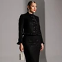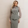 Безупречный силуэт, внимание к деталям - главные ценности бренда "Мода-Юрс", которые нашли отражение в костюме из жаккарда в полоску с акцентной брошью. Жакет прилегающего силуэта с рельефами по переду и спинке. Спинка со средним швом. Отрезная по линии талии. Рукав втачной, одношовный со складками по окату.