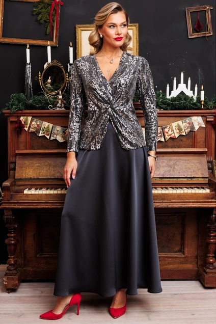 Продолжением нашей нарядной коллекции является роскошный комплект, состоящий из блузы, имитирующей жакет, и невероятной струящейся юбки длины макси. Блуза из ткани в пайетки с декоративным узлом в области талии. V-образный вырез. Блуза приталенного силуэта с втачными, двухшовными рукавами. Блуза частично на подкладке. Юбка на поясе с резинкой.